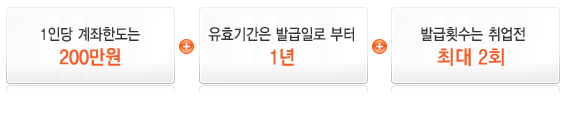 1인당 계좌한도는 200만원, 유효기간은 발급일로부터 (취업성공패키지 참여자중 일부 300만원) 1년, 발급횟수는 취업전 최대 2회 (원칙)