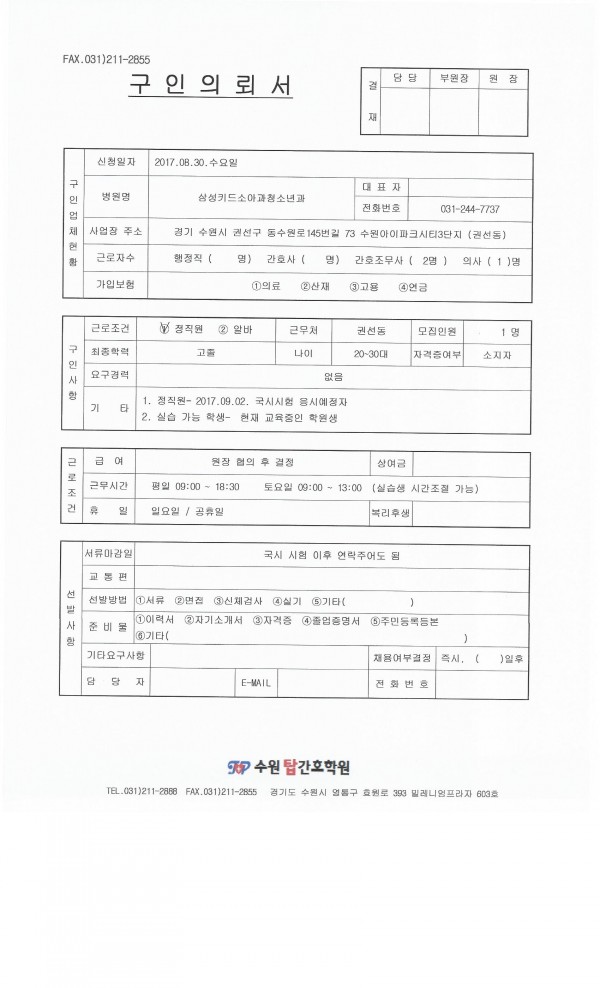 | 제목 | 삼성키드소아과청소년과의원 채용공고입니다. | 작성일 | 17-08-30 14:47 |
