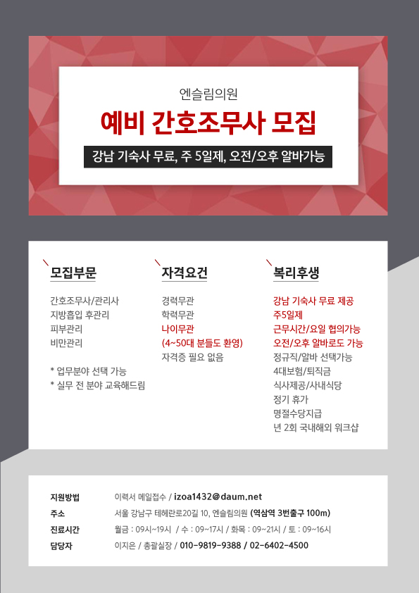| 제목 | (강남기숙사무료제공)피부관리선생님/예비간호조무사선생님모집 | 작성일 | 17-11-08 14:29 |